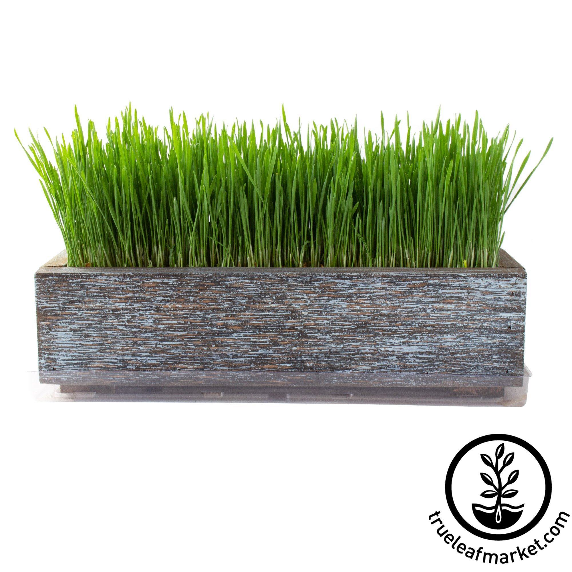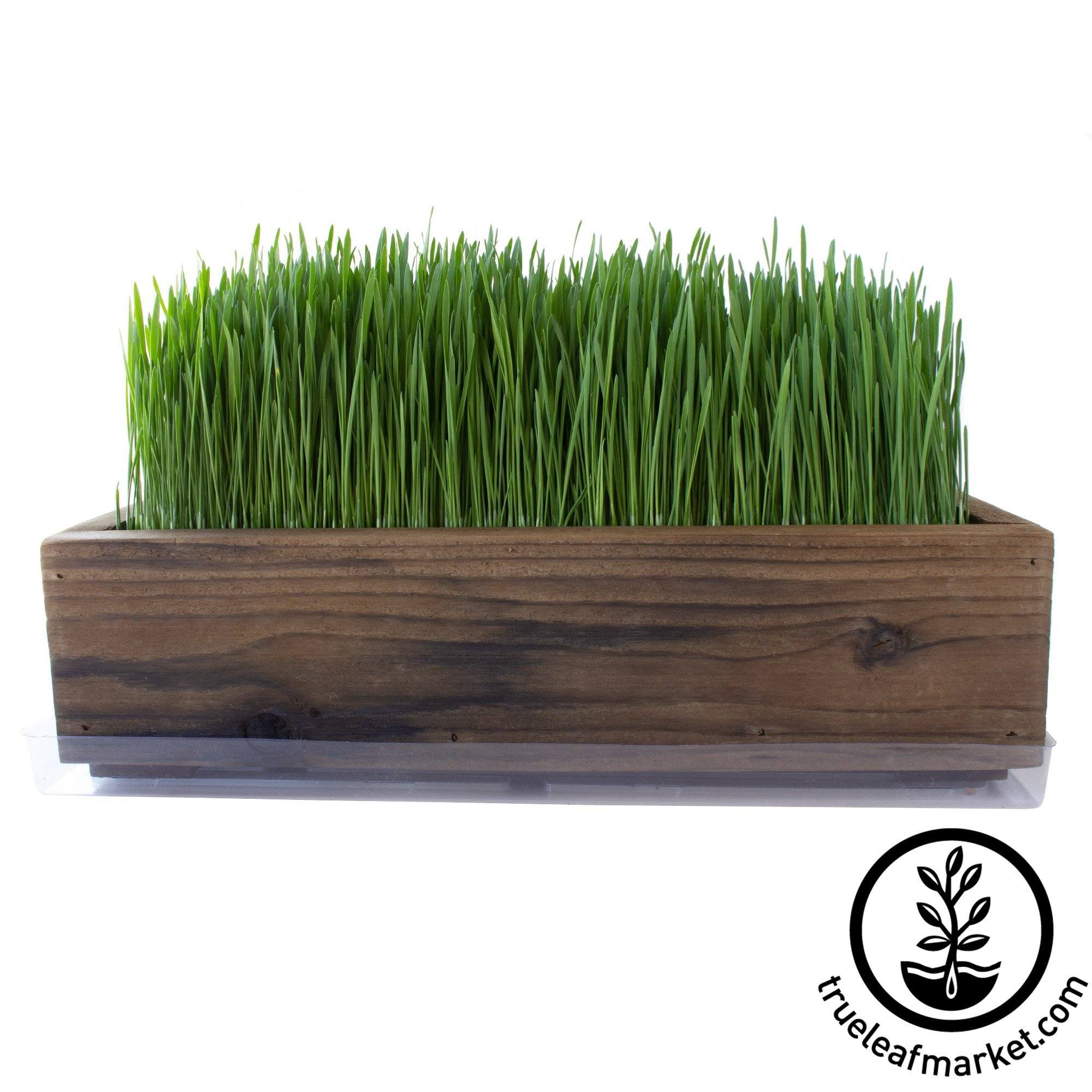This amazing rustic barnwood style planter (includes clear plastic drip dray) is ideal for growing wheatgrass indoors. Made from Western Red Cedar and finished with Clark's Food Safe cutting board wax with an orange fragrance. An attractive addition to any home or kitchen, the complete kit is everything you need to grow stunningly beautiful wheatgrass. Complete kit includes barnwood style planter, drip tray, compressed soil, instructions and selection of certified organic wheatgrass seeds. Enough soil and seed for three complete plantings. Grow for wheatgrass juice, grass for indoor pets, or as a decorative planter or centerpiece. The barnwood style planter measures 15" by 6.5" by 3.5" High. The inner dimensions (growing area) measure: 14.5" by 4.75" by 2.75" deep.