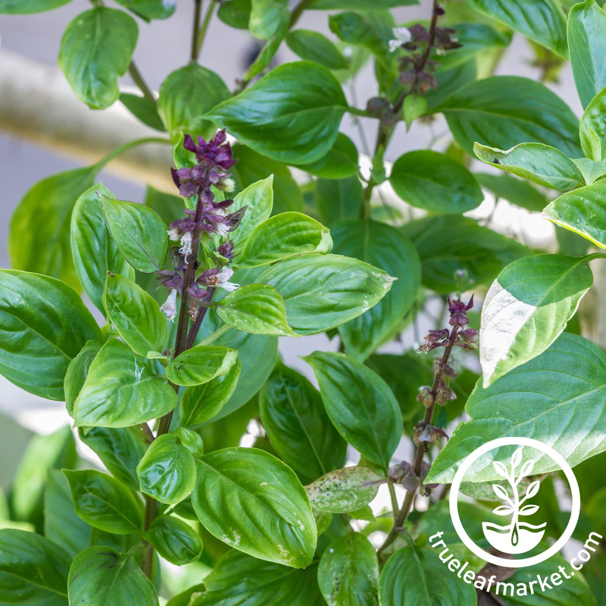 Anise Basil Seeds. Non-GMO, Heirloom. 70 Days. Anise Basil is unique in that it has zesty basil flavors with sweet licorice-like flavors incorporated. Plants have dark green leaves with purple stems, and blossoms are a red-purple color, and become a light pink-purple color when they have fully flowered. ~2000 Seeds / Oz.
