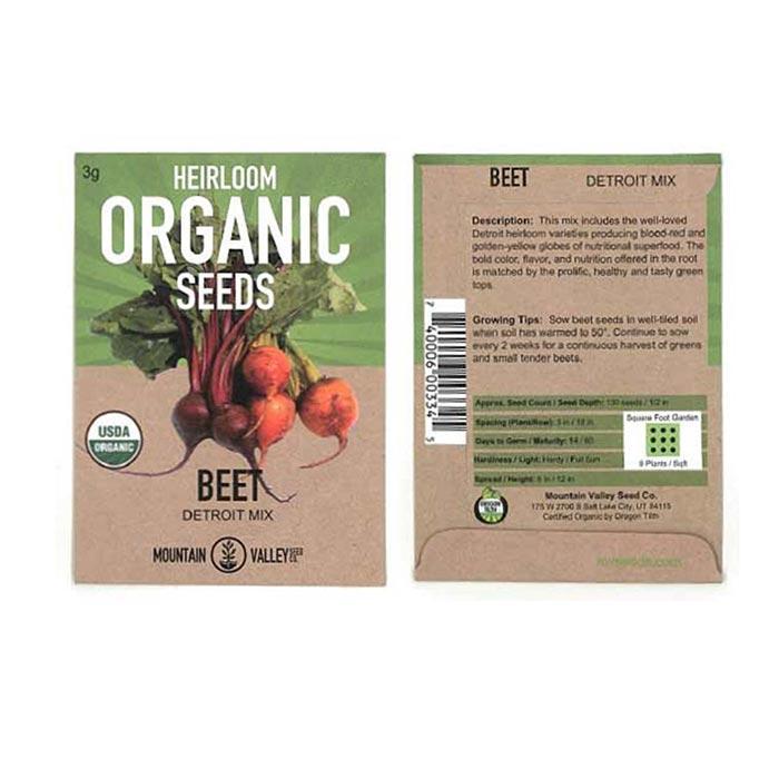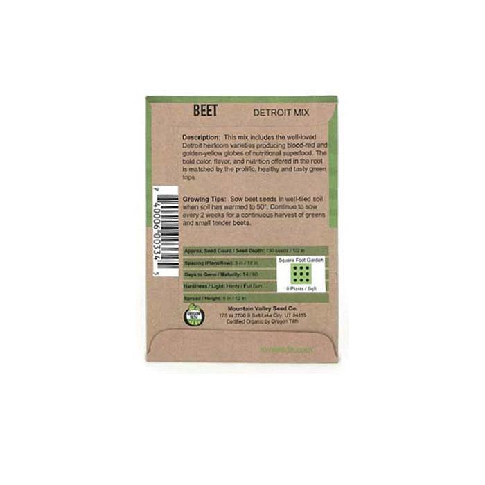 60 days. Heirloom, Non-GMO. Certified Organic. This mix of Detroit Red and Golden Beet seeds will make for a colorful and tasty harvest with all the warm shades of summer. This is a packaged mix of seeds for both red and golden Detroit Beet gardening seeds. This mix can work perfectly for a colorful vegetable harvest. The Beets are great for cooking or pickling, and the greens can work well as part of a salad.