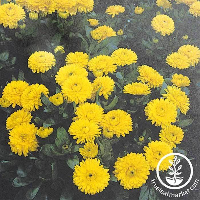 91 – 98 days. Bon Bon Series seeds grow one of the most celebrated, lush, and brilliant blooms of any calendula. Bon Bon Series seeds promise conveniently dwarfed 12" tall bushy calendula mounds bursting with dense 2 – 3” fully doubled golden pom-pom bulbs. Bon Bon Series seeds are an ideal grow for compact indoor pots, planters, containers, and patios or as the star to any fresh cut bouquet or arrangement. Bon Bon Series is a vigorous garden performer, easy to grow from seed, and matures sooner than other calendula varieties. 1000 seeds.