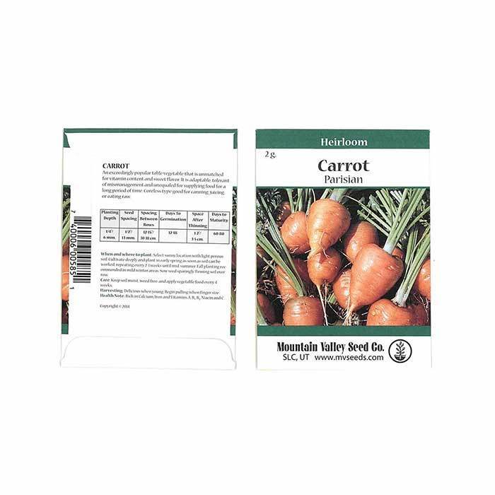 60 days. The Parisian carrot seeds produce round roots. This garden crop thrives with full sun in zones three to nine, and does best in sandy, well-drained soil, though it can also grow in rocky soil. The Parisian carrot matures earlier than most other carrots, ready to harvest in around sixty days. The variety is sweet and tender. This round carrot is frequently used in containers or forced off season in cold frames and tunnels. Also great in heavy soils where long carrots are difficult.