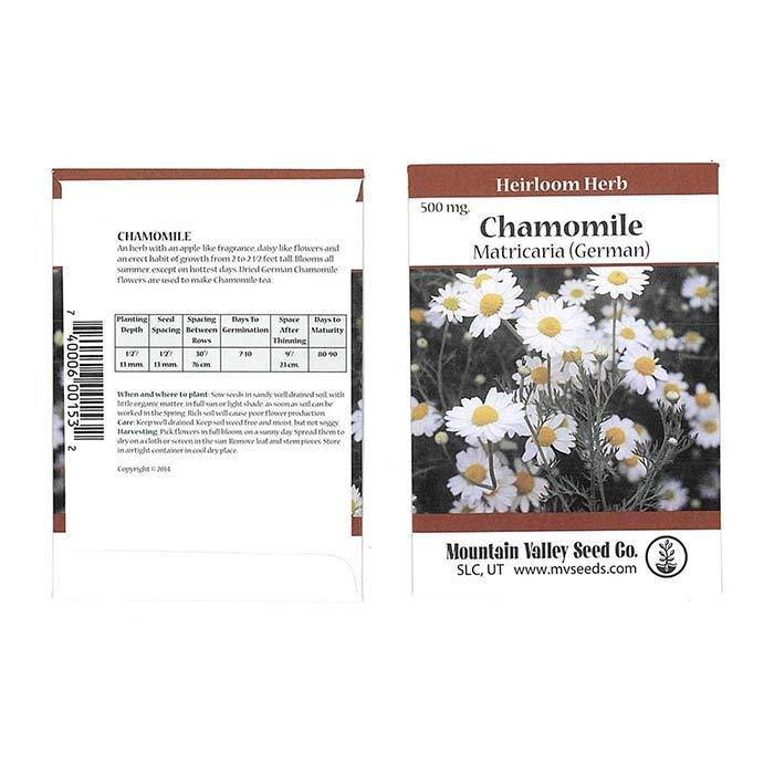 Non-GMO German Chamomile Seeds. German Chamomile (Matricaria recutita) is most noted for its use in alleviating inflammation and stress. Its tiny flowers emit a sweet fruity fragrance.