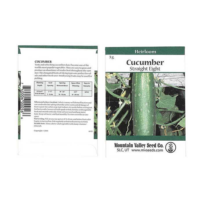 58 days. The Straight Eight cucumber is an early variety of cucumber that is sweet and tender. The Straight Eight is large with a small seed cavity. Since this variety is mature in just fifty eight days, a steady harvest can be achieved by planting regularly throughout the season. AAS Winner. 8 inch fruits are dark green with white spines and small seed cavity. Very vigorous. Approx. 1,000 seeds/oz.