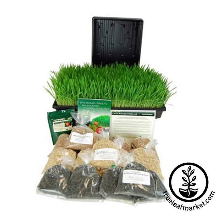 The ultimate living foods starter kit. Grow and juice your own wheatgrass, barley grass, and sunflower greens for pennies a day. Kit includes soil, seed, trays, azomite, instructions, and more. Easy, healthy & fun. Certified Organic Seeds.