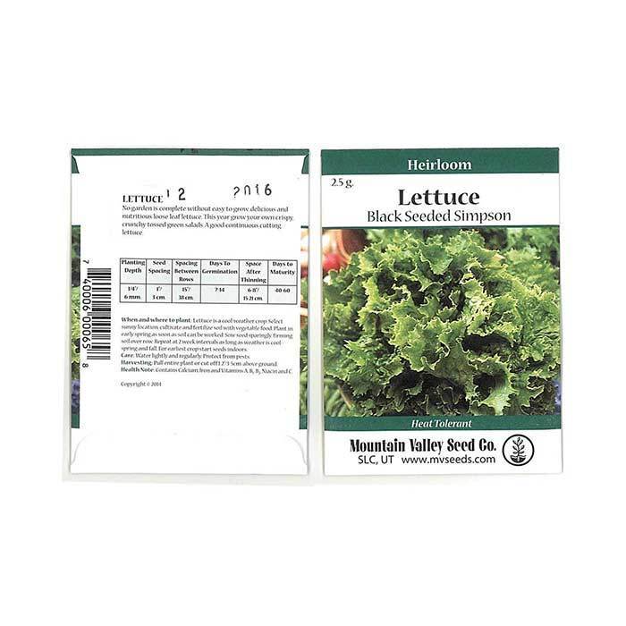 Non-GMO Black Seeded Simpson Lettuce (Lactuca sativa) is a type of leaf lettuce. It’s one of the fastest growing types of leaf lettuce. You can harvest Black Seeded Simpson as early as 45 days after planting. It has a light sweet flavor and a delicate texture. Black Seeded Simpson is an annual that grows in zones 3-9. It is a cool weather crop, but it needs full sun to really thrive. In warmer areas, Black Seeded Simpson can be planted in the fall for a late harvest. When grown during the summer it needs to be protected from extreme heat. Black Seeded Simpson is great for salads, sandwiches, as a garnish, in smoothies, and other recipes.