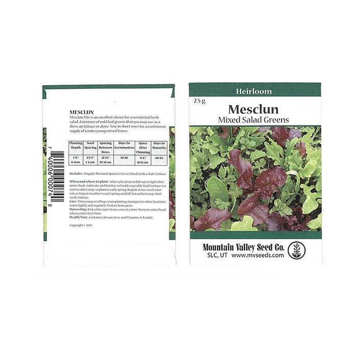35-75 days.  This mesclun mix grows into vibrant greens that can be harvested anywhere from baby leaf to adult stage.  This seed grows well in most areas of the US and is terrific for Spring and Fall plantings.  A wonderful collection of greens of differing color, texture and flavor, the mix includes:  Arugula, Spinach, Swiss Chard, Endive, Kale, Mustards and Lettuces. Approx. 16,000 seeds/oz.