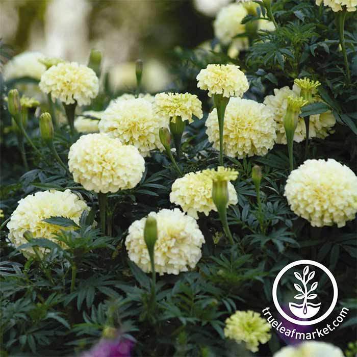 77 – 84 days. Vanilla marigold seeds grow some of summer's most elegant, classic, and vigorous blooms. Marigolds are hardy outdoor favorites for growing unique, gentle color for lining the back of the garden or a decorative planter. Vanilla seeds grow timeless 18” marigolds bursting with neat 2 – 3” heads of delicate eggshell white. Vanilla marigold is easy to grow from seed and known to thrive in a variety of gardens prone to heat, drought, and poor soil across North America. 500 seeds.